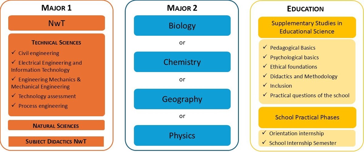 The study of NwT as a third subject in the so-called Extension Master's degree (M.Ed. Extension Subject) consists of all subject-related and subject-didactic modules of the regular Bachelor's and Master's degree program NwT (see overviews B.Ed. and M.Ed.). Detailed information on modules and courses can be found in the module handbooks can be found in the module handbooks.