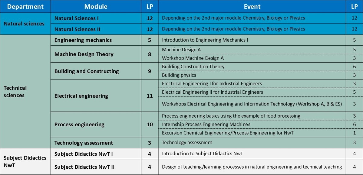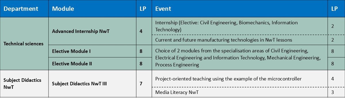 The NwT teaching degree consists of the Bachelor's degree (6 semesters) and the Master's degree (4 semesters). Please refer to the module handbooks to find out how the proportions of technical and scientific content and subject didactics are divided between the Bachelor's and Master's degree courses. The Bachelor's and Master's degree programs consist of the following components: