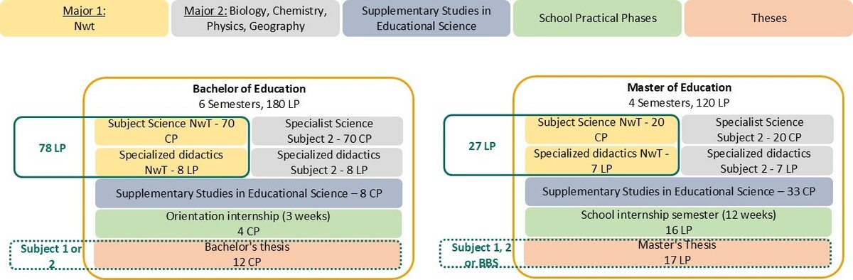 The scope of the respective content is specified in credit points (CP). 1 CP corresponds to a workload of approx. 30 hours. In the Bachelor's degree course, the focus is on subject-specific training, whereas in the Master's degree course, the proportion of accompanying studies in educational science and school practice for the acquisition of pedagogical and practical school skills is proportionately higher. In both the Bachelor's and Master's degree programs, didactic courses combine subject-specific science and didactics and are specifically designed to meet the requirements of NwT teaching.