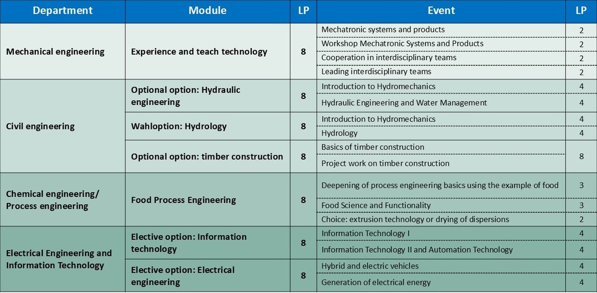 The Bachelor's degree program is mandatory and teaches the basics of natural sciences (biology, chemistry, physics) and mathematics as well as the basics of engineering (civil engineering, electrical engineering, mechanical engineering and process engineering).